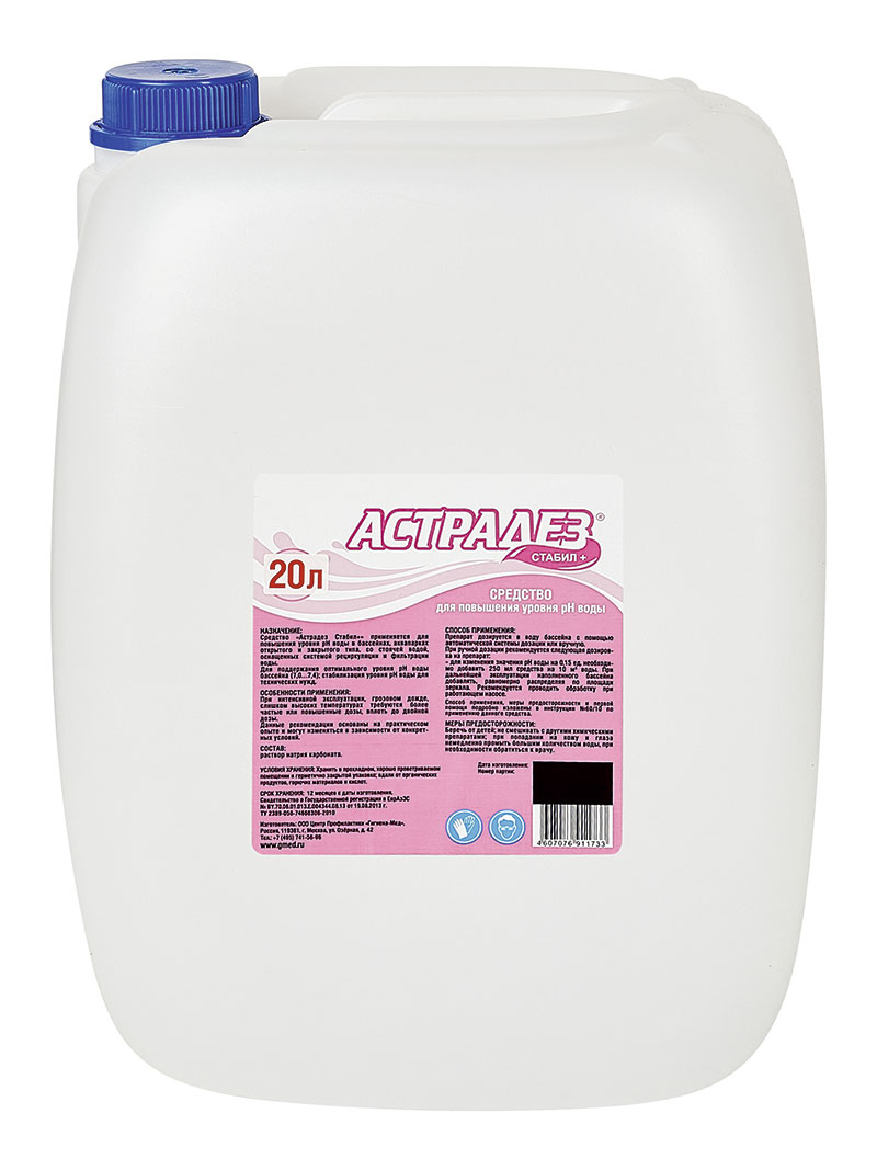 Астрадез Стабил + представляет собой прозрачную жидкость, предназначенные для стабилизации уровня pH питьевой воды, воды для технических нужд, плавательных бассейнов, аквапарков, декоративных водоемов и т.д.