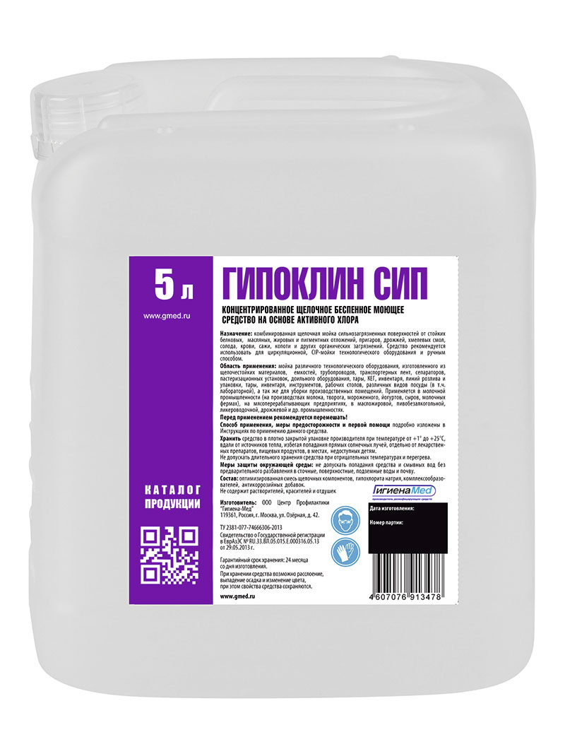 «Гипоклин СИП» представляет собой концентрированное жидкое щелочное моющее средство с дезинфицирующим эффектом на основе хлора. В своем составе содержит оптимальное соотношение специальных поверхностно-активных веществ, комплексообразователей, активных моющих добавок и пеногаситель. Средство применяется для комбинированной мойки и дезинфекции сильнозагрязненных поверхностей из любых щелочестойких материалов. Препарат эффективно способствует очистке от белковых, масляных, жировых и пигментных отложении, пригаров, дрожжей, хмелевых смол, солода и других органических загрязнений с поверхностей из щелочестойких материалов. Средство рекомендуется использовать для циркуляционной, CIP-мойки технологического оборудования и ручным способом.