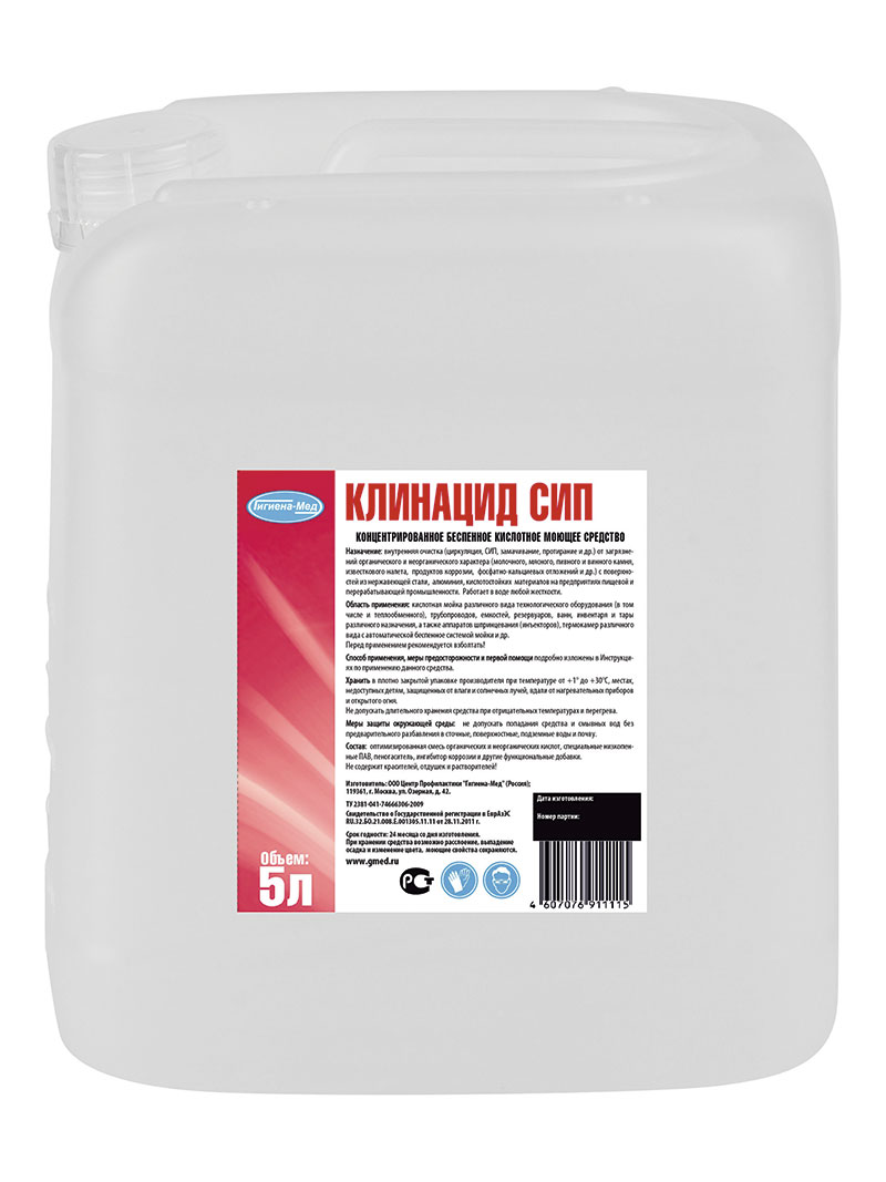 «Клинацид СИП» представляет собой концентрированное жидкое кислотное моющее средство. В составе продукта оптимизированная смесь кислот, а также различные функциональные добавки, специальные высокопенные ПАВ и пеногаситель. Препарат эффективно способствует очистке от любых видов механических и прочных минеральных загрязнений: известкового налета, ржавых подтеков, карбонатных солей, фосфатно-кальциевых отложений, дрожжевых остатков, жировых и белковых отложений, а также трудноудаляемого молочного, мясного, пивного и винного камней с кислотостойких поверхностей, в т.ч. из нержавеющей стали, алюминия.