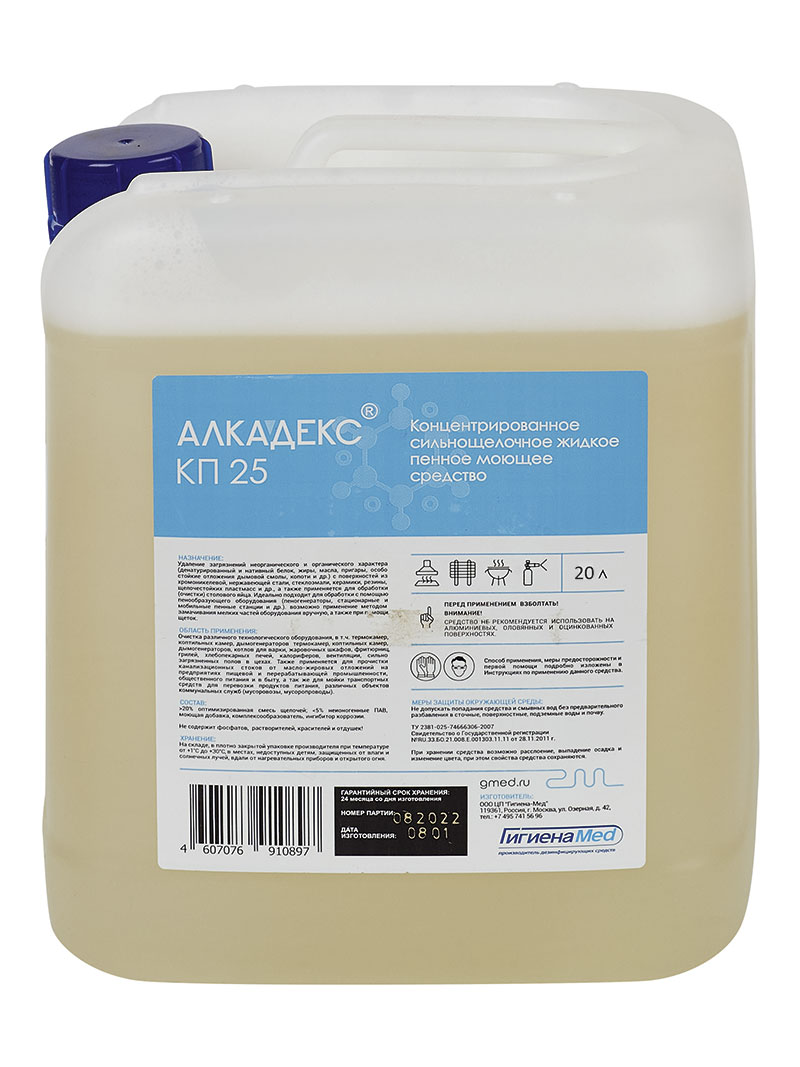 «Алкадекс КП 25» представляет собой концентрированное жидкое сильнощелочное пенное моющее средство. Содержит оптимальное соотношение щелочных, комплексообразующих, антикоррозионных и диспергирующих веществ, а также специальных пенных ПАВ, что позволяет быстро удалять загрязнения неорганического и органического характера (денатурированный и нативный белок, жиры, масла, пригары, особо стойкие отложения дымовой смолы, копоти и др.) с поверхностей из хромоникелевой, нержавеющей стали, стеклоэмали, керамики, резины, щелочестойких пластмасс и др., а также применяется для обработки (очистки) столового яйца. Идеально подходит для обработки с помощью пенообразующего оборудования ( пеногенераторы, стационарные и мобильные пенные станции и др.). возможно применение методом замачивания мелких частей оборудования вручную, а также при помощи щеток.