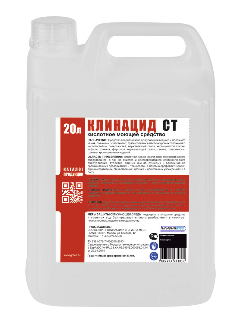 «Клинацид СТ» представляет собой концентрированное гелеобразное кислотное средство. Помимо оптимизированной смеси кислот, в состав продукта также входят различные функциональные добавки, специальные высокопенные ПАВ, а также пеногаситель. Обладает хорошими очищающими и обезжиривающими свойствами. Хорошо удерживается на вертикальных поверхностях.