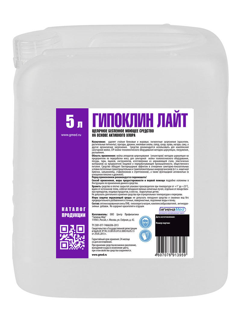 «Гипоклин ЛАЙТ» представляет собой концентрированное жидкое щелочное моющее средство с дезинфицирующим эффектом на основе хлора. Содержит в качестве действующего вещества гипохлорит натрия, а также комплекс ПАВ, щелочей, комплексообразователей, антикоррозионных добавок. Средство применяется для комбинированной мойки и дезинфекции сильнозагрязненных поверхностей из любых щелочестойких материалов. Препарат эффективно способствует очистке от белковых, масляных, жировых, и пигментных отложений, крови, сажи, а копоти и других органических загрязнений с поверхностей из щелочестойких материалов. Используется вручную, с помощью оборудования высокого давления, пеногенераторов, стационарных и мобильных пенных комплексов, методом погружения и замачивания.