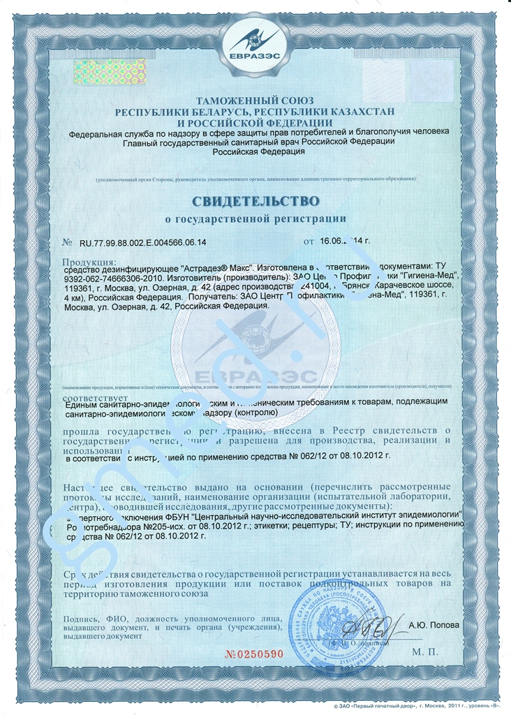 - для дезинфекции изделий медицинского назначения и специальных гигиенических, косметических и проч. из различных материалов (в т. ч. хирургических, гинекологических и стоматологических инструментов, включая ротационные и замковые, слюноотсосов, стоматологич. оттисков из альгината, силикона, полиэфирной смолы; зубопротезных заготовок из металла, керамики, пластмассы, артикуляторов); жёстких и гибких эндоскопов и медицинских инструментов к ним; отдельных узлов, блоков и комплектующих деталей аппаратов ингаляционного наркоза и искусственной вентиляции лёгких; шумо- и водоизоляционных беруш, имплантов, в т. ч. протезов, искусственных костей, стентов и силиконовых имплантов; слуховых аппаратов и вкладышей к ним; в т. ч. зубных имплантов, брекетов, штифтов и стоматологических коронок;